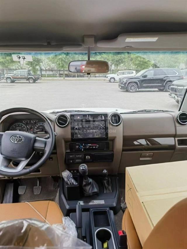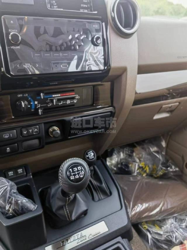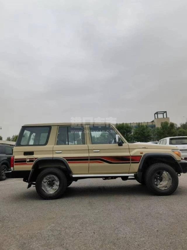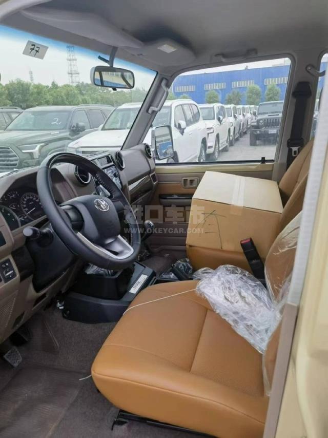 配置 :23款丰田LC76 汽油4.0 、沙漠黄/棕 车架号多台 5速手动变速箱 130升油箱 分时四驱 前差速器 后差速锁 16英寸合金车265/70R16 刹车:前盘后鼓 前悬螺旋弹簧 后悬板式弹簧 ABS+VSC+BA+EBD+HAC+ATRC 2气囊 彩色保险杠,黄车黑杠)高位刹车灯 、镀铬外后视镜带电动调节 、侧踏板 、数字时钟 5座 、空调 、熏黑大灯、熏黑轮毂、电动门锁 、电动车窗 、收音机 CD 、蓝牙 、2个扬声器 、胎压监测 、USB快速充电 、前雾灯 、后雾灯 、手套箱带钥匙 、日行灯、徽章、脚垫、黑色轮眉、散热格栅、彩条、桃木方向盘、桃木档把、桃木内饰、真皮座椅