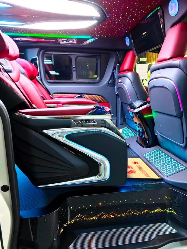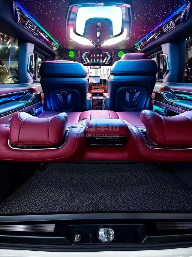 配置 :丰田小海狮商务车改装: 外观: 新款埃尔法大包围, 旅行者装饰高顶行李架, 18寸锻造轮毂米其林轮胎, 内饰: 全车轻量化模压内饰模具件定制2K12.5寸光纤大屏导航系统, 索尼高清360环影 丰田电装前后8雷达 丰田流媒体后视镜 19喇叭大马克莱文森音响, 进口波尔多红头层牛皮座椅, 主副驾丰田电装通风加热, 车载高端香氛负离子系统, 定制版五门发光合金踏板, 二排头等舱航空座椅, 三排沙发床带通风加热按摩, 车规级氛围灯星空顶, 劳斯莱斯同款星空顶 26寸置顶2K电视, 编织纹耐磨地板, 后仓语音控制系统, 定制车规级航空灯, 整车三层隔音降噪, 双侧电动车电尾门, 水晶档把,定速巡航, 全车实木皮内饰 大功率220V电源 后仓冷暖空调 新款扶手箱带压缩机冰箱 海狮专用中门扶手